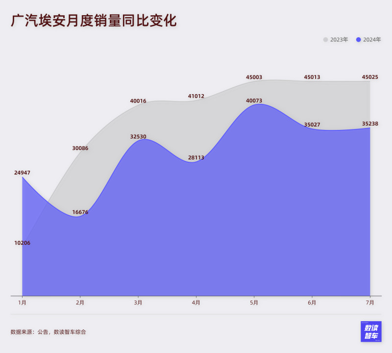 这似乎就是埃安目前尴尬处境的一个缩影。埃安7月销量35238台,同比下滑了21.7%。今年7个月,埃安有6个月销量是同比下滑的。只有5月销量突破4万台,而在去年,埃安连续10个月销量破4万,其中去年9月甚至一度站上5万台。