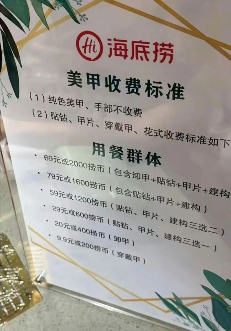 如今,海底捞的这项美甲服务都开始明码标价。据媒体报道,多个海底捞美甲服务开始收费,山西一家海底捞店员称美甲最高收费可高达79元。