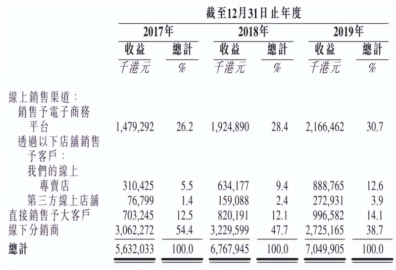 如今看,这次激进转型为蓝月亮埋下了隐患。招股书显示,2017年-2019年,蓝月亮线上销售占比由33.1%提升至47.2%,线下分销商销售占比由54.4%下降至38.7%。