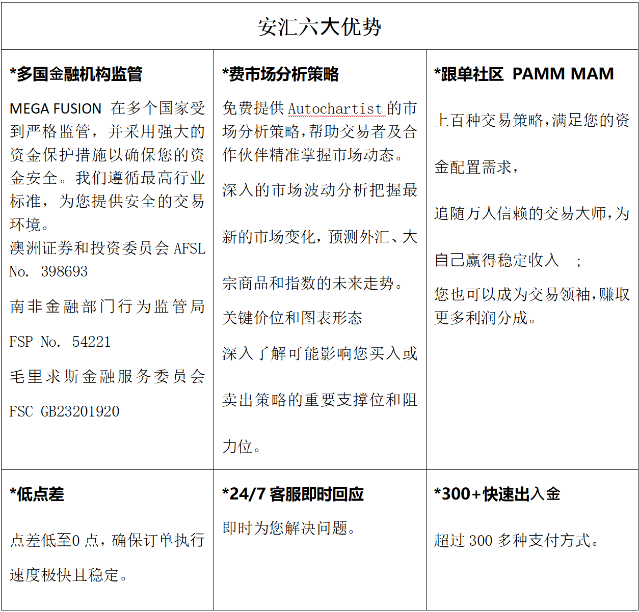 安汇MEGA FUSION 以「汇聚安心,创造财富」为愿景,致力成为交易者心中信赖且可靠的安心之选。MEGA FUSION深知透明度与专业性对交易者的重要性,因此始终将客户需求置于核心,确保每位客户皆能在安全、稳定的交易环境中获得最佳体验。