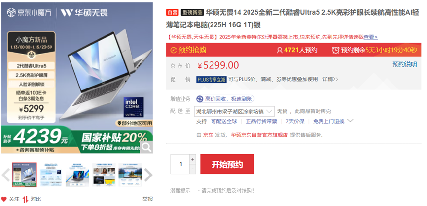 全新机身设计,机身轻约1.4Kg,薄至1.69cm,轻薄度进一步提升,方便户外携带。屏幕则是一块2.5K 16:10高分辨率护眼好屏,亮度高达400nit,并拥有100%sRGB高色域,精准呈现画面细节。护眼方面不仅支持DC调光,还通过莱茵TUV低蓝光护眼认证,减少有害蓝光,时刻守护用眼健康。目前华硕无畏14 2025已在电商平台正式开启预购,抢先预购还可参与国补活动,预计到手价仅4239,选购价值极高。