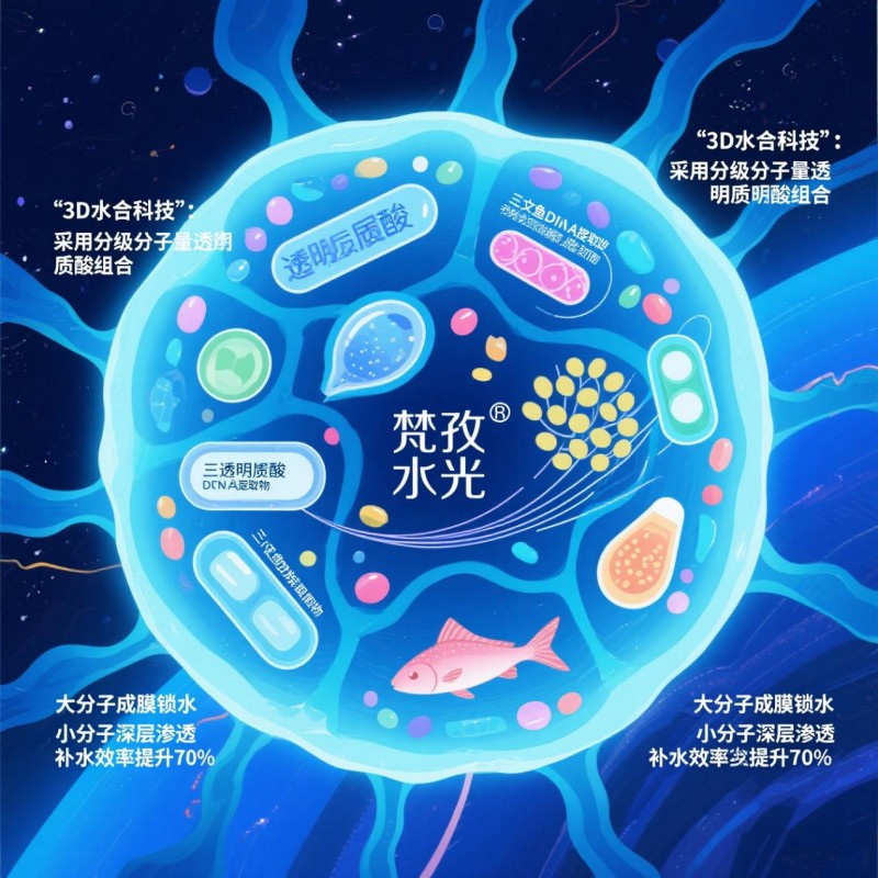 3D水合科技:采用分级分子量透明质酸组合,大分子成膜锁水,小分子深层渗透,补水效率提升70%。