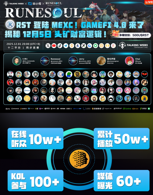 本次直播旨在复盘 Runesoul 代币($RST)首发上线 MEXC(抹茶交易所)的市场表现,并深度解析其生态规划。直播在 X (Twitter)、Binance Live、火币 Live、Gate Live、YouTube、TikTok 等全球 10+ 个主流平台同步进行,引发了行业现象级关注。